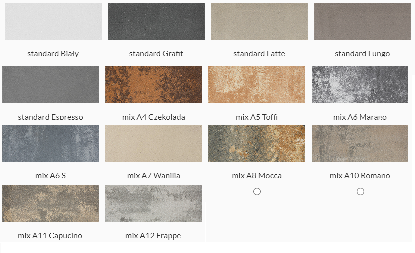 Kolory: biały, grafit, latte, lungo, espresso, A4 czekolada, A5 toffi, A6 marago, mix A6s, A7 wanilia, A8 mocca, A10 romano, A12 frappe