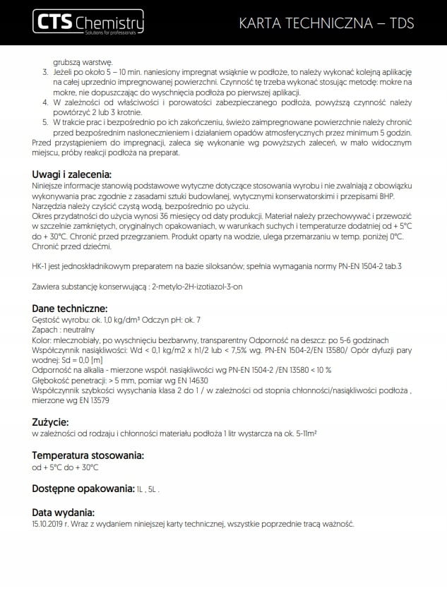 - Impregnat HK–1 produkowany jest w formie gotowej do użycia. Nie rozcieńczać.