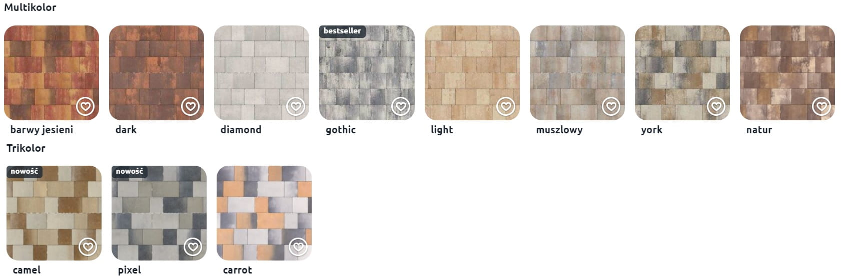 Kolory: light, dark, diamond, gothic, muszlowy, york, natur, carrot, barwy jesieni, camel, pixel